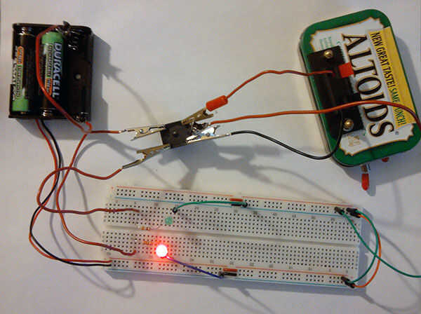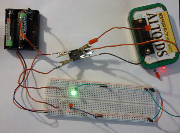 En la foto donde el LED verde se encienda el circuito tiene 5 voltios de alimentación se aplica a los pines A y B de mi fuente de alimentación de 5 voltios regulados Altoid. El poder de las dos baterías de AA está fluyendo al pin 1 y 3, entonces a través del LED y de vuelta a las pilas.