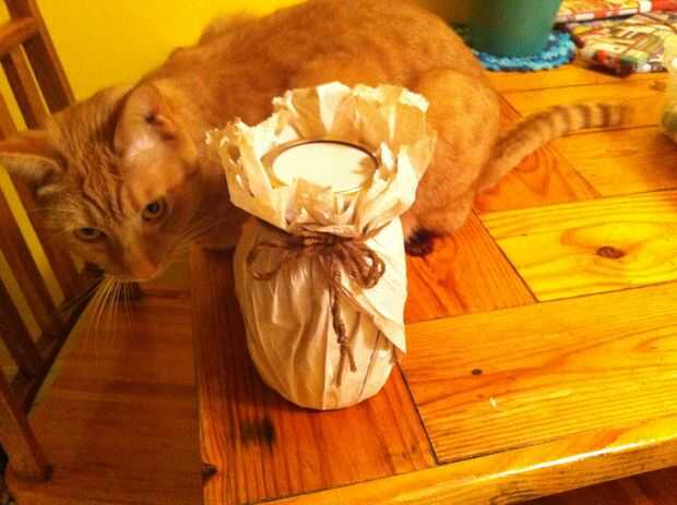 Me envolvió el frasco en papel de seda beige y atados con un trozo de hilo. Lo más importante: Asegúrese de que su gato inspecciona su envoltura cuando termines.