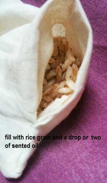 en primer lugar hacer una almohada de algodón pequeño rectángulo doblando un 13" x 7" tela de algodón de rectángulo por la mitad y coser en 2 lados. ahora vuelta adentro hacia fuera y llenarlo con grano de arroz y una caída de nuestro dos de su favoritos aceite perfumado.