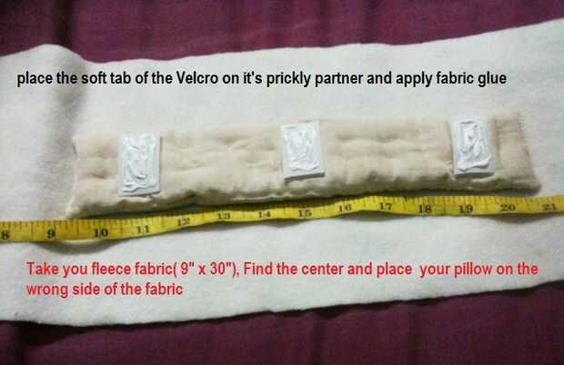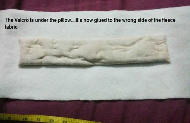 Tomar la almohada y coloque la lengüeta suave de la parte posterior del Velcro es espinoso compañero... aplicar el pegamento de tela en la parte posterior de la misma y darle la vuelta y coloque en el centro del lado equivocado de nuestra tela del paño grueso y suave.