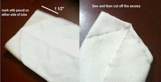 Ritmo de su plantilla en ambas esquinas y dibujar los ángulos puntiagudos... coser y luego cortar la tela sobrante. Vuelta adentro hacia fuera otra vez.