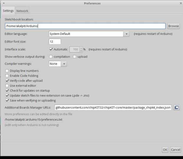 Así que después de descargar el MPLABX y Arduino ide, tenemos que instalar el núcleo Chipkit. Vamos a seguir el paso 1 en la URL que se auto Instale utilizando URL de github. Se copia la URL de github (que es https://github.com/chipKIT32/chipKIT-core/raw/master/package_chipkit_index.json), luego diríjase a la ide de Arduino y seleccione Preferencias y en ' cuadro de diálogo adicional Junta administrador URL pegarlo.