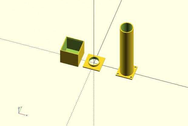 Esto no resultó ser una buena ubicación. Demasiado ruido de todos los componentes que lo rodean. Conseguíamos interrupciones nos dice para ajustar el ruido y luego que tenía que estar justo en la parte superior de él con el simulador de rayos para obtener cualquier respuesta en absoluto. Necesitábamos a alejarse de la otra electrónica. En retrospectiva, nos deberíamos haber sabido que esto sucedería. ¿La solución? Alejarse de la caja en un pilón. Pensamos en mover el WeatherPiArduino en una torre, pero hemos decidido poner sólo una AS3835 en la torre. Ver los archivos 3D de impresión anteriores. Abajo se encuentra las tres partes como ven en la pantalla en OpenSCAD y seguido por una foto de la torre impreso e instalado en la caja de WeatherPi. Aquí están los archivos OpenSCAD para el pilón.