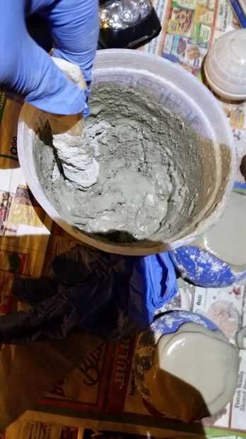 Nota: No mucho tiempo se encuentra entre el punto de que se introduzcan la mezcla de cemento y el agua y el punto de que el cemento se endurece más allá del uso, y durante este tiempo el cemento debe colocarse en el molde. Como tal, mezcla y vierte deben hacerse rápidamente y con precisión, por lo que sugiero leer el resto de este instructable antes de hacer cualquier cosa y potencialmente pérdida de un lote de material de la estrella de la muerte.