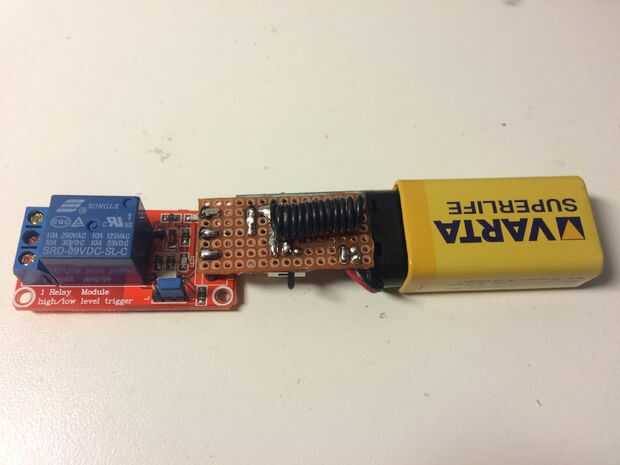 Poner la batería en el soporte y atornille la antena, conectar el receptor al módulo de relé y conectar la batería de 9v al clip.