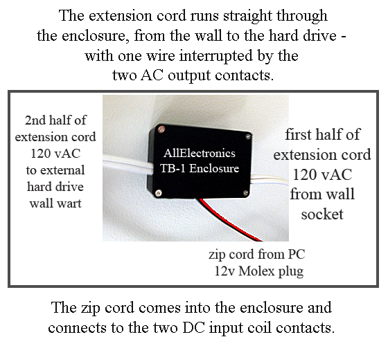 Su recinto ahora debe verse así. Quizá quieras enchufarlo en la pared, enchufe una lámpara en el otro extremo y conecte el cable de zip a un 12v fuente o (9v batería voluntad trabajar) - la lámpara debe encender y debe apagar cuando se quita la tensión del cable de zip.