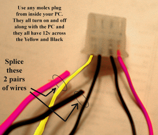 La forma profesional es insertar un adaptador de molex, llamado un "adaptador Y". Tiene tres enchufes y está destinado a "Y" una fuente de alimentación adicional. Corte todos los 4 cables de la Y y quitar el tapón. Corte el exceso sin usar rojo y negro los cables molex y empalme el cable zip directamente a los cables negros y amarillos en el adaptador Y.