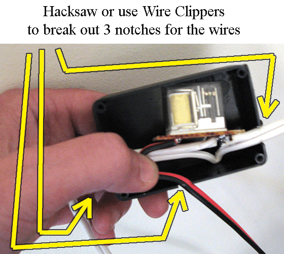 El plástico es blando, por lo que usted puede utilizar una sierra para metales, una dremel o incluso un conjunto de cortadores de alambre para cortar dos ranuras y los utilice alicates para romper el plástico y crean la muesca. Luego inserte el relé y vuelva a enroscar la tapa.