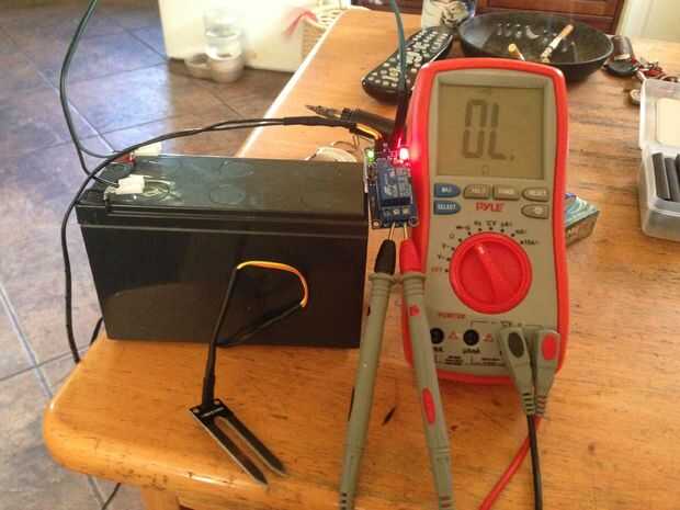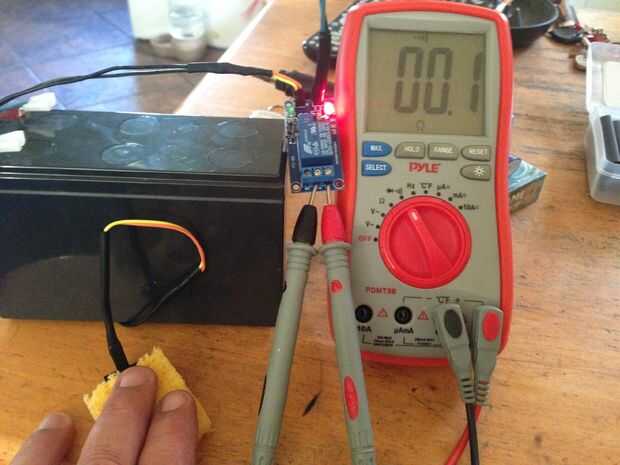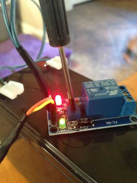 Hay un potenciómetro ajustable que se puede recortar con un destornillador Phillips pequeño. De la imagen, utilicé una esponja, que no funcionaba así que acabé utilizando otro enchufe rápido rooter y había bloqueado el sensor en el mismo. Mojar en agua y escurra el agua hacia fuera a la sequedad que desee el sensor para el relé de sobre. Ahora gire el potenciómetro hasta que el led verde apaga, luego a su vez lo contrario un poquito, luego esperar la luz verde no enciende lentamente de cinco a diez segundos, gire otro poquito y espere otra vez. Repita el proceso hasta que se encienda la luz. Lentamente se iluminará más brillante hasta las salidas de relé. Dunk el sensor o vierte agua en su medio y la luz va hacia fuera, sacar hacia fuera la luz y el medio deben poco a poco volver a. Usted puede hacer este proceso con el suelo también, utilizaría unas tazas de suelo con diferente humedad/sequedad para ajustar a tu gusto.