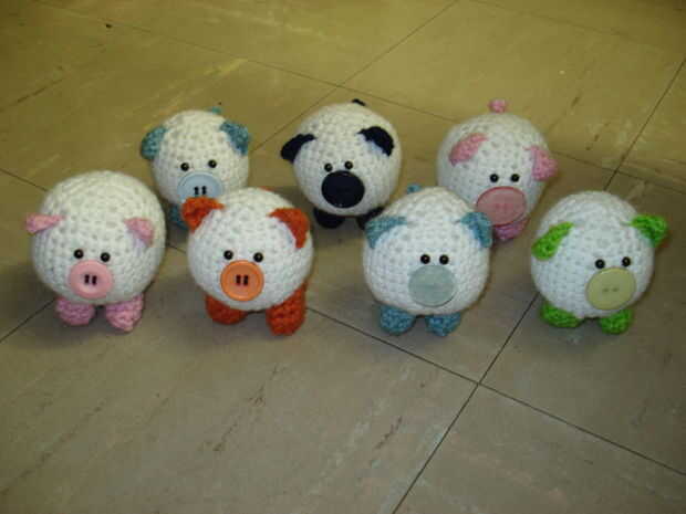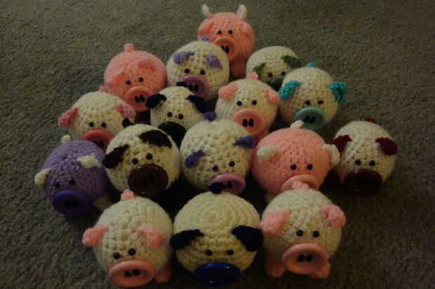 este año, mi hermana y yo decidimos hacer cerdos para recaudar fondos para el Relais para la vida, porque nuestro tema fue: 'Enraizamiento para una cura'. El patrón original era de la marca del León, pero porque queríamos cambiar, lo hizo y terminó utilizando las formas básicas y crear nuestro propio patrón. Este fue el resultado. Corrimos fuera de botones, así que usa unos diferentes. También hicimos volantes cerdos - ver cuadro 2 en la parte posterior. En general, hicimos más de 50 y donó todo el dinero a la sociedad americana del cáncer.