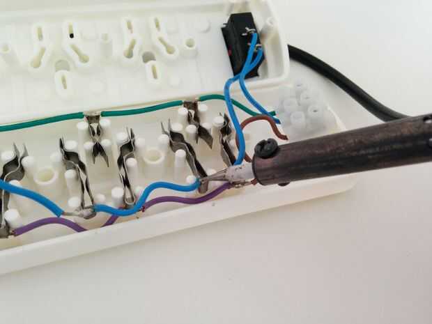 En el caso de la toma de corriente encontré (un muy barato, no recomendable), el cable que se unieron todas las salidas tenía varios puntos de soldaduras. Lo que hice fue dejar que ellos sueltos para dar potencia a cada salida por separado. El cable neutro (en este caso, una violeta), fue dejado sin tocar.