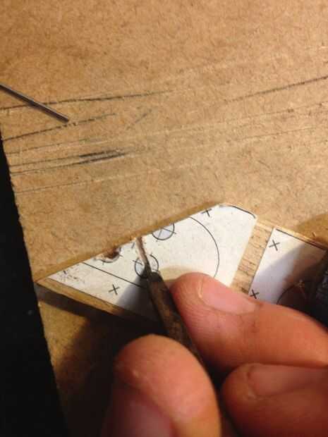 Este paso implica escopleando con gubia la ranura para el pivote que transforma el medallón de forma ovalada de un corazón. La ranura se corta en los pedazos gruesos de 4mm utilizando un cincel. Conecte a tierra el cincel de un pedazo de acero HSS. El cincel fue molido en un espesor de 1mm y la ranura fue tosido a partir del centro y el escopleo con gubia hacia fuera a una profundidad de 1mm.