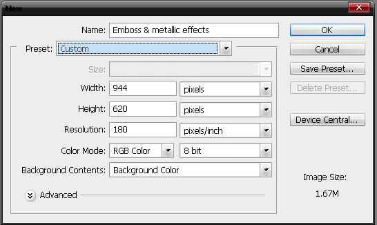 Abierto un nuevo lienzo cámbiele el relieve y efecto metálico, 944 x 620, 180 dpi y fondo blanco. Rellenar con negro.