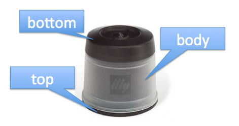 La cápsula está en tres partes, como se puede ver en la imagen. El extremo inferior va primero a la máquina, el cuerpo del café y la parte superior todo en. El color le indica qué tipo de café - negro para la negrita, azul para largo (para "tira mucho") y verde para descafeinado.