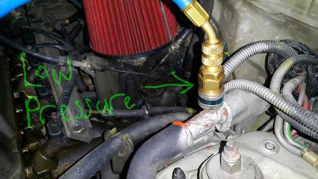 Desenrosque la tapa protectora en el puerto de baja presión de aire acondicionado del coche. Contará con un capital L en él.