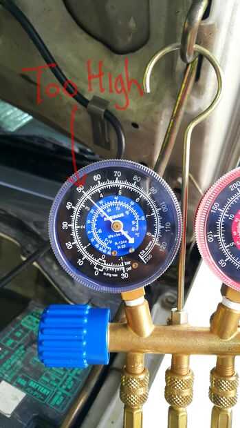 Debido a una distracción importante en casa, accidentalmente dejé demasiado refrigerante en el sistema (sí mi mala!). El compresor comenzó ciclo de encendido y apagado rápidamente. Inmediatamente apague el interruptor de CA y había cerrada la válvula de baja presión en el conjunto de manómetros. He quitado el R134a puede y abre lentamente la válvula de baja presión para liberar algún refrigerante. Cerré la válvula y vuelva a encender el compresor. Repetí este proceso hasta que el valor de la presión baja fue 22psig con el embrague del compresor a.