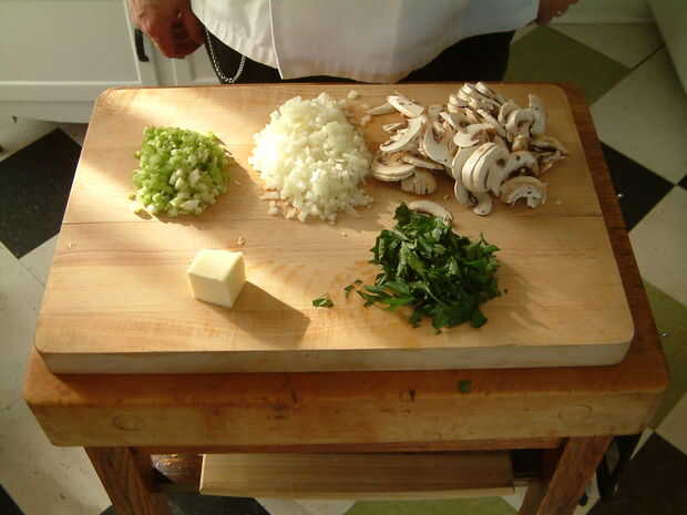 Comienza por saltear la cebolla, apio y champiñones en la mantequilla hasta que comiencen a dar vuelta a marrón. Apagar el fuego, añadir el perejil y ligeramente temporada la mezcla. Digo ligera porque su será más oportunidades a pasos de la temporada en el futuro. Siempre puede agregar más condimentos. Es muy difícil de sacar.