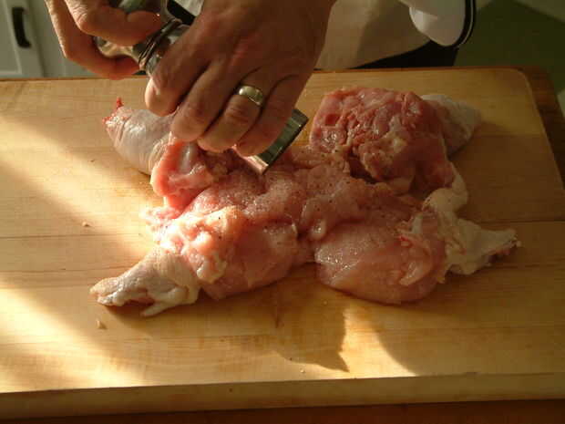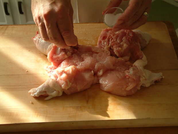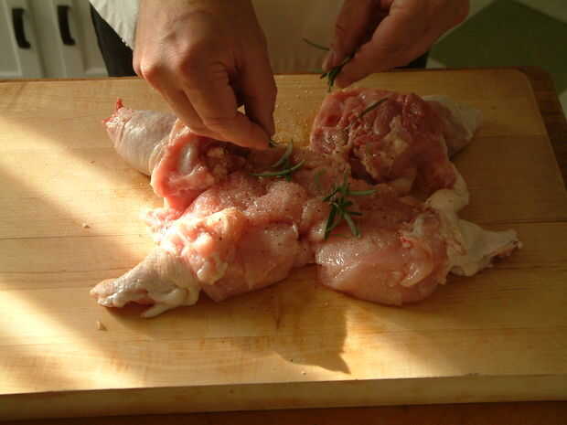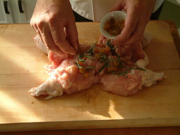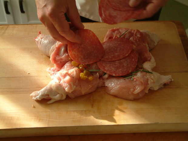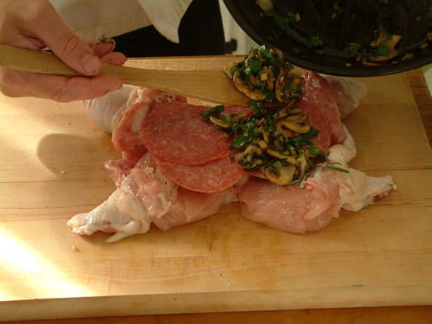 Mientras que su mezcla de saltear es cocinar y enfriamiento, puede comenzar a condimentar y rellenar tu pájaro. Espolvorear el interior con sal, pimienta y Romero. Repartir las pasas y forrar el espacio hueco con Salami. Terminar rellenando con la mezcla de champiñon.