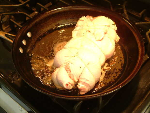 Una bandeja de horno grande prueba del calor y añadir un bonito botón de mantequilla. Cuando la mantequilla está derretida y chisporrotea, añadir el pollo relleno y marrón por todos lados. Dar un buen dorado como esto ayudará la piel crujiente y sabrosa.