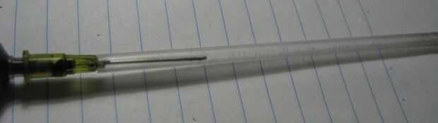 Retire la jeringa y deje la tinta casi caer hacia fuera y en el momento cuando la columna de tinta está amenazando con caer del tubo (ver figura 2), el punto metal de la materia en el (cuadro 3). Limpie el exceso de tinta.