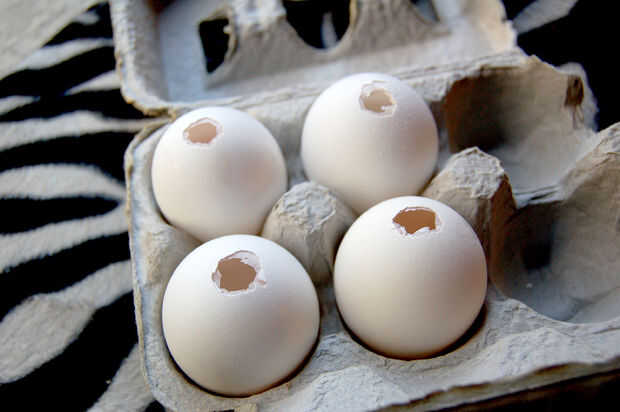 Corte un pequeño círculo en la parte inferior de un huevo crudo (yo usé una tijera de uñas) y agítalo para que salga la yema. Enjuagar el interior con agua caliente y calor en el horno a baja temperatura tfor 20-30 minutos para limpiar y secar.