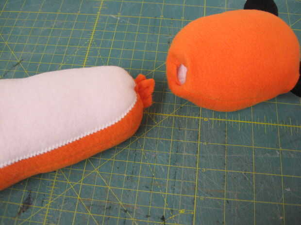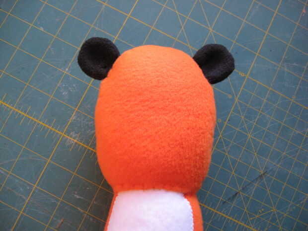 Utilice naranja un hilo a coser la cabeza en su lugar. Slipstitches agradables y apretados funcionan mejor para esto, así como para la fijación de los brazos, las piernas y la cola al cuerpo. Aprender a hacer el slipstitch aquí. (Gracias jessyratfink).
