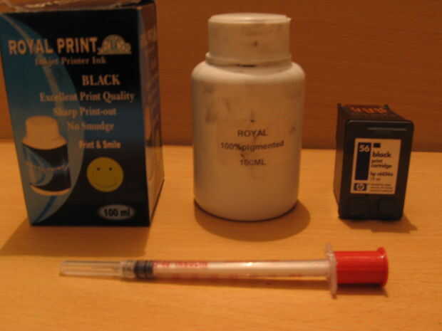 1. tinta de la impresora. Usted puede comprar de una tienda de informática. En Bangalore, usted puede comprar de una tienda de recarga de cartuchos en la entrada del SP Road, cerca de mercado de la ciudad. 2. una jeringa desechable de 1ml. Cuanto menor sea la aguja, mejor. 3. el cartucho de la impresora. Mi impresora utiliza un cartucho HP56. Pero el método de recarga es el mismo para la mayoría de cartuchos de tinta.