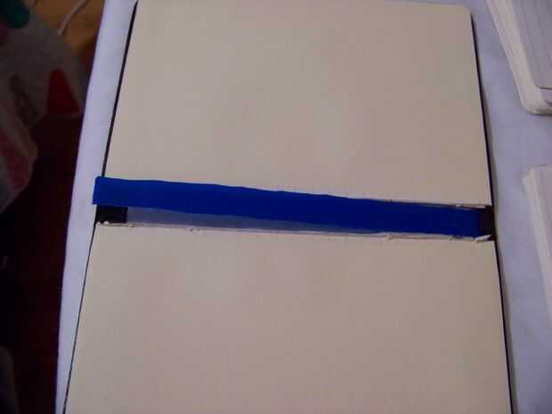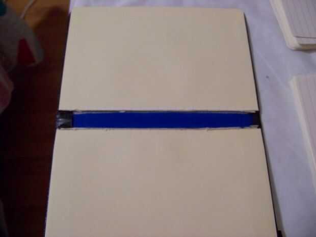 Ahora es el momento de utilizar esa 5.5 x.75 pulgadas pedazo de cartón o plástico. Deben ser delgada, 1 a 2 milímetros, pero fuerte. La finalidad de este es apoyar la columna vertebral al colocar las bandas que mantienen lo Cahiers en su lugar. Como he dicho antes, esta parte es opcional. Sólo me gustó la forma en que veía cuando las bandas comenzaron a empujar hacia abajo en la columna vertebral. No es gran cosa aunque.