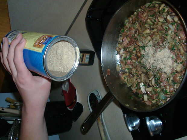añadir una tabla de las migas de pan llano a la sartén y mezclar bien