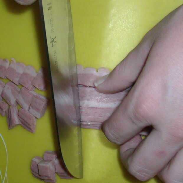 cortar cuatro rebanadas de su favorito tocino en cubos