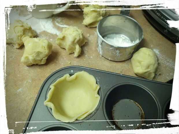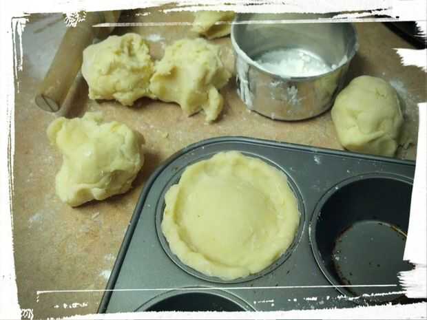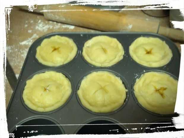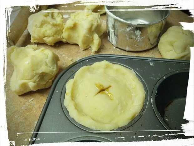 Tomar el pie masa y corte (o desgarro) en 6 pedazos. Estirar cada pieza y use una taza grande para recortar un círculo. Tomar ese círculo y estirar un poco. Presione en un molde sin engrasar de muffin y llenan 2/3rds de la mezcla de carne. Tomar los trozos de ese 1/6 de pastel de pasta y smoosh en un círculo. Pulse ese círculo de masa sobre la masa rellenos de carne en la cacerola del mollete, prensar los bordes de la base y tapa Junta (no tiene que ser perfecto). Corte una abertura en la parte superior.