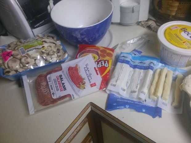recoger todo lo que he hecho mi propia masa casera y aderezos lo que usted quiere para dos clases de setas de carne y alguna salsa de pizza casera de pimienta verde no se muestra pero fue agregado más adelante en la necesidad