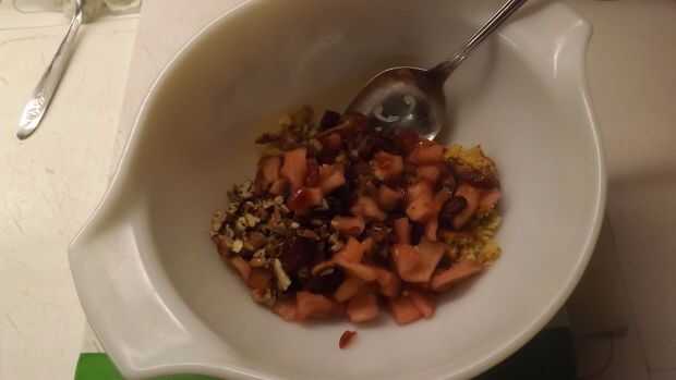 2. Añada las rodajas de manzana picada y arándanos secos al jugo; cubrir con una tapa y cocer a fuego lento durante 15 minutos.