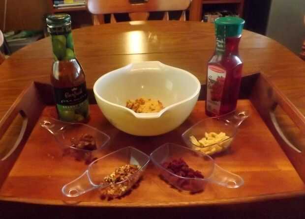 6. Mezclar bien los ingredientes del relleno, agregar suficiente líquido reservado para humedecer ligeramente. Seguir reservar el restante zumo de fruta...