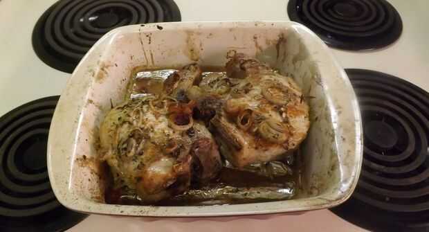 * (Me gusta Hilvanar las chuletas de cerdo para hornear otra vez después de haber cocinado destapada durante 15 o 20 minutos).
