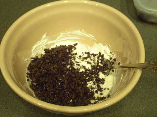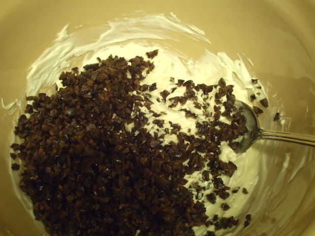 Ahora que se mezcla con la mayo, abrir la lata de aceitunas con el abrelatas. Agregar el queso crema y mezcla de mayo. Mezclar con la cuchara.
