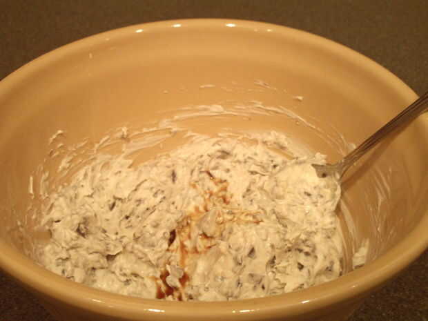 Después de mezclar, sacar la botella de salsa inglesa. Abrir y lanzar un dash en el recipiente. Esto le dará el relleno mucho su sabor salado! Mezclar y apartar.