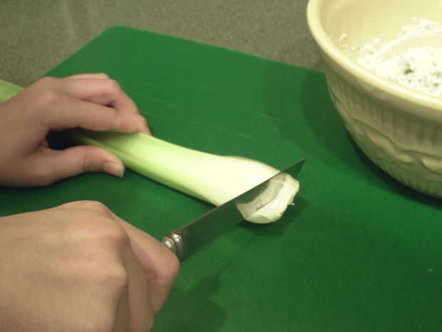 Se hace el relleno! Así que ahora, tenemos que obtener nuestro apio. Tomar unos trozos de tallo y limpie en el fregadero. Retirarlos a su tabla de cortar y, usando su cuchillo, cortó los extremos brutos y deshacerse de ellos. Balón a un lado.