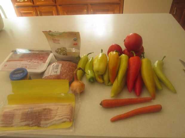 Cosas que necesitará5 pimientos verdes grandes1 lb carne de cerdo de tierra1 lb carne molida1 cebolla de vidalia en cubos grandes5 huevos grandes5 dientes de ajo picadoSalsa de tomate (8 oz)3 tazas de arroz integral1 taza de espinacas picadas1 taza d