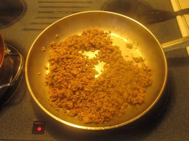Alevines hasta seis o más tiras de tocino en la sartén. Retirar el tocino, poner en un tazón con una toalla de papel y drenar la grasa de la sartén. Dorar el pavo de tierra en la misma sartén utilizada para freír el tocino. También puede obtener sabor tocino todo eso bueno infundido en el pavo de tierra.