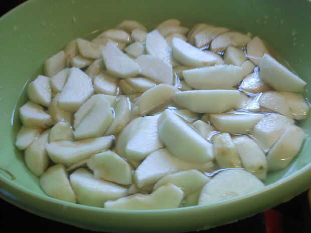Coloque las rebanadas en la mezcla de agua de limón, luego en los tarros esterilizados, dejando 1" cabeza.