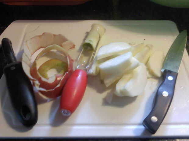 Peeling, perforación y corte 7 cuartos de galón de manzanas.