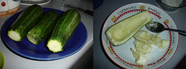 Corte los calabacines, primero las puntas y luego en mitades. Luego los talle con una cuchara; Trato de hacer barquitos.