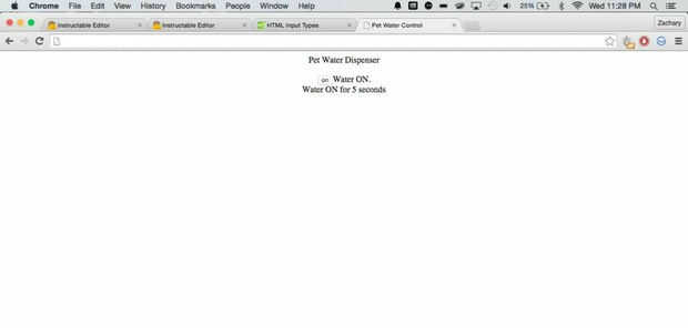 Para probar el dispositivo, pegar en la dirección IP que copiaste en el paso anterior en cualquier navegador y pulse enter. Verá tres botones. Además, asegúrese de que ha rellenado el dispositivo con agua, asegurándose de que el motor sí mismo no está sumergido, sólo el plástico de la bomba. Presione el botón de "Agua" unas cuantas veces para obtener el agua que fluye. Usted debe oír el motor en el giro de la bomba. Si no es así, compruebe el cableado.
