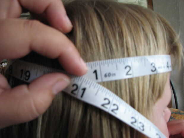medida que los niños la cabeza todo el camino alrededor. Mida desde la parte superior del centro de la cabeza hasta la parte posterior del cuello. las mediciones se utilizará para hacer un sombrero de tipo de beenie para el interior de la peluca.