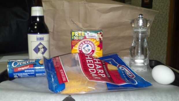 -1 lata (8 oz) Media Luna refrigerado Pillsbury® rollos de cena -1/2 taza rallado queso Cheddar (2 oz) -1 huevo -1 cerveza de malto o portero la botella (12 oz) -1 cucharada de bicarbonato de sodio -Mar de sal (o kosher)