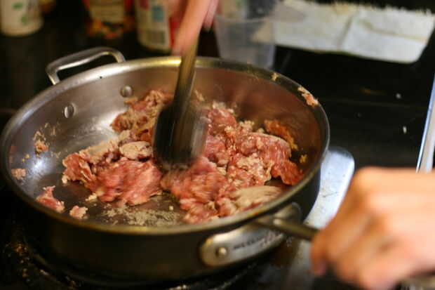 • Agregar chorizo, desmenuzar en trozos grandes y cocinar hasta que estén dorados.