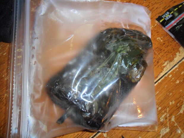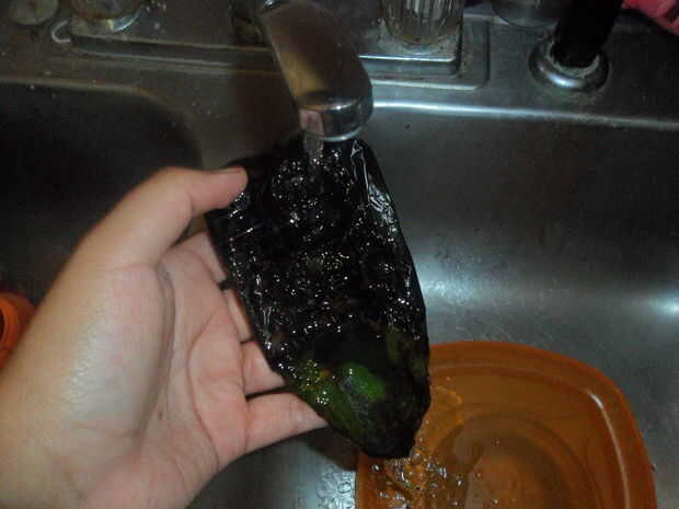 Una vez que el pimiento está ampollado y ennegrecido, meterlo en una bolsa ziploc o en un recipiente cubierto con plástico de envolver.  Que vapor de al menos 5 minutos, que generalmente dejan de vapor por 10.  Destapar el recipiente o descomprimir la bolsa y abra el agua fría.  Retire con cuidado la piel ennegrecida con la agua corriente.  Debe salir fácilmente.  Asegúrese de no usar demasiada fuerza porque puede desgarrar el pimiento suavizado y eso no bueno.  Ponga a un lado.