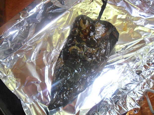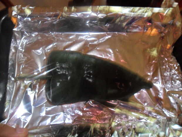 Usted puede hacer esto de dos maneras.  Puede utilizar una bandeja de plancha de hierro fundido, calentar para arriba y ennegrecer la pimienta o usted puede poner en el asador y gire cada pocos minutos.  Lo pongo en el asador porque esta pimienta se forma bastante cobarde.  Me volví sobre cada 2-3 minutos.