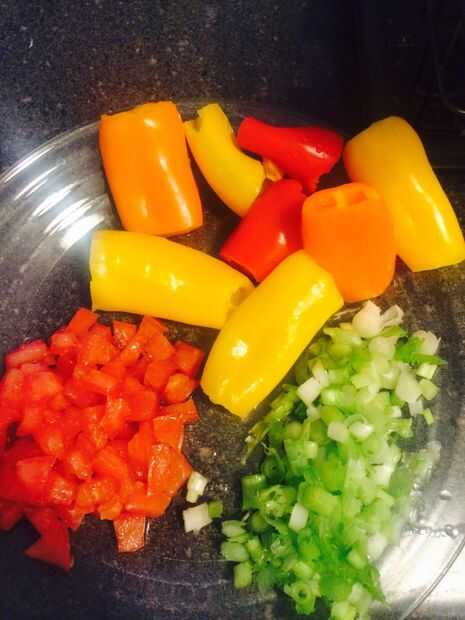 Paso 6: I reunió a todas las verduras y comenzó a rellenar los chiles con los tomates y cebollas.